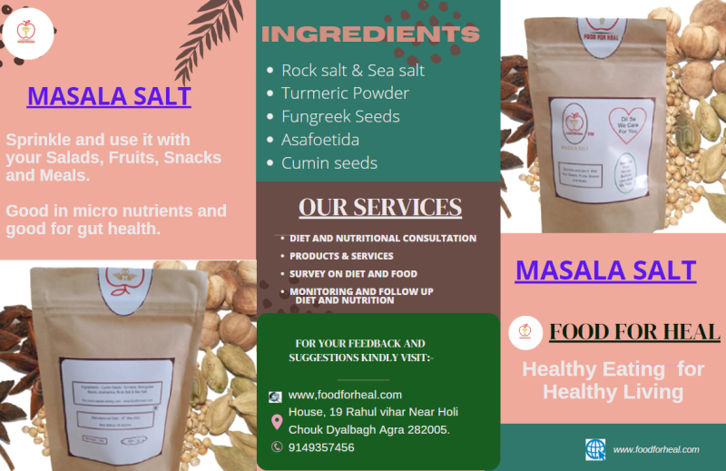 Basic ingredient is salt which is mixed with gut friendly spices like cumin seeds, asafoetida, fenugreek seeds, turmeric, rock salt and sea salt. All are in powdered form and prepared by special method. Enjoy it with your meals, snacks and fruits. Good for your gut health and good in micronutrients.
